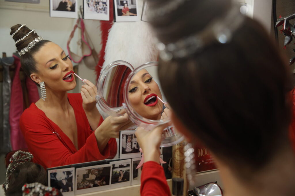 Dans les loges, tout le monde s’active entre coiffure et maquillage. Les artistes du Moulin Rouge réalisent eux-mêmes leur maquillage de scène chaque soir. Les danseuses parent leurs lèvres de rouge et leurs yeux de faux-cils, seules obligations au Moulin Rouge. Pour le reste de leur maquillage, les artistes du célèbre cabaret peuvent laisser libre court à leur imagination et affirmer leur personnalité et leur style à coup de fards et d’eyeliner.