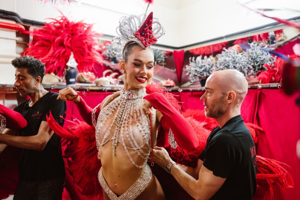 Le premier spectacle de la soirée touche à sa fin. Les artistes du Moulin Rouge saluent les spectateurs avant de quitter la scène sous un tonnerre d’applaudissements. Cependant, la soirée ne fait que commencer ! Une collation et quelques étirements plus tard, il faut se préparer pour la deuxième représentation.