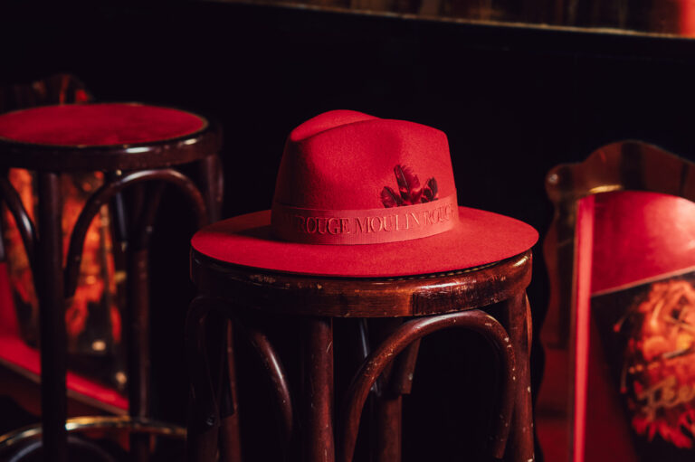 A tribute to the iconic colour of the Moulin Rouge, this striking red hat is adorned with subtle features and sports an elegant headband displaying three repetitions of the cabaret’s name to evoke the effervescence and magic of the place!