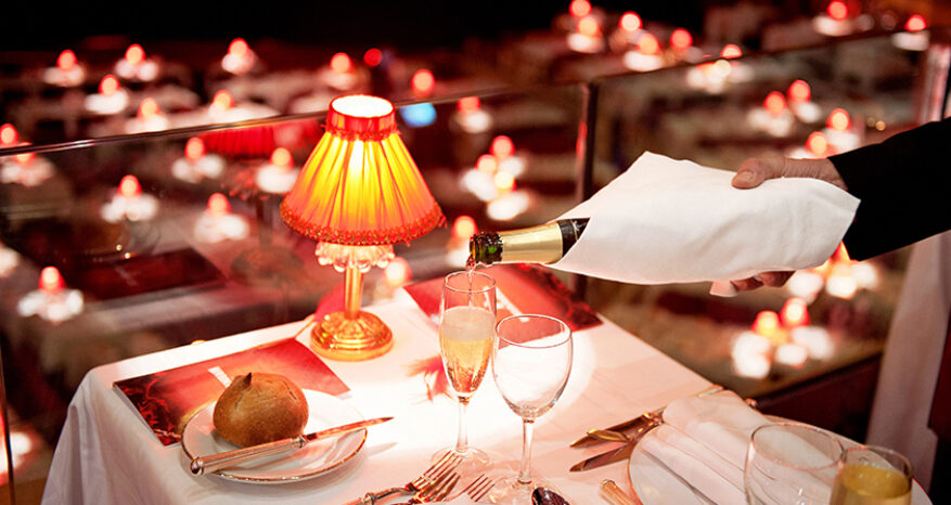 Created by our Chef, the dishes are then served one after the other in an elegant dance routine, punctuated by the tinkling of plates and glasses as well as by the “pop” of champagne bottles opening one by one. Dessert marks the end of this feast for the tastebuds in the Palace of dance.